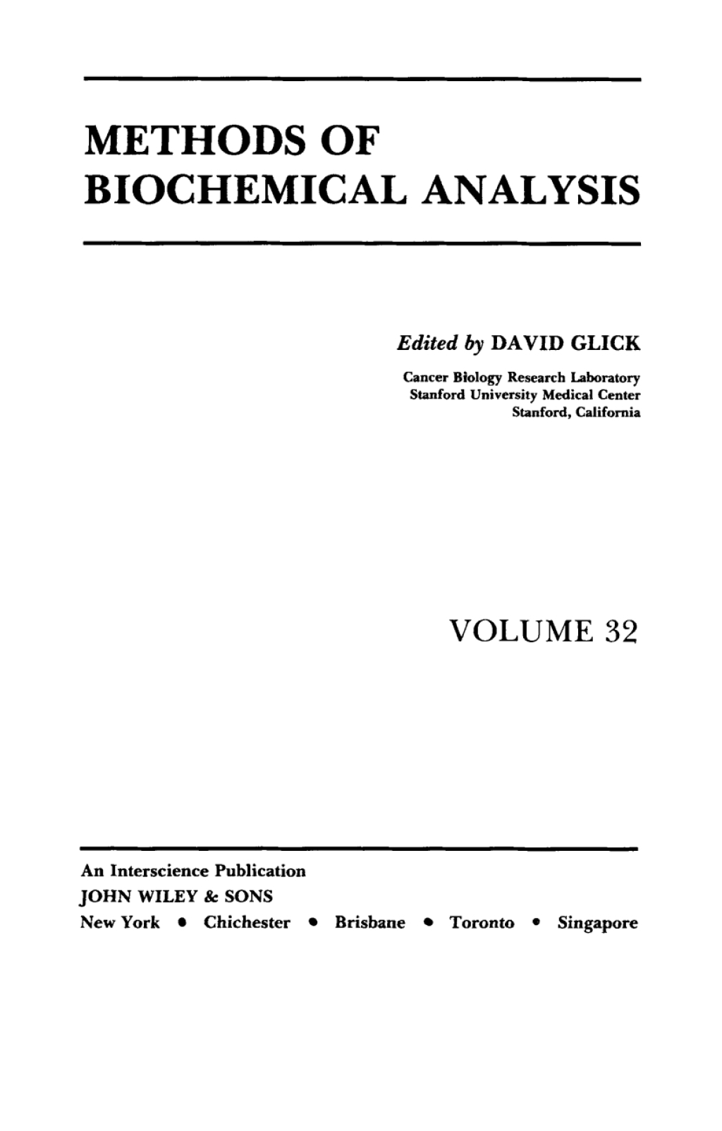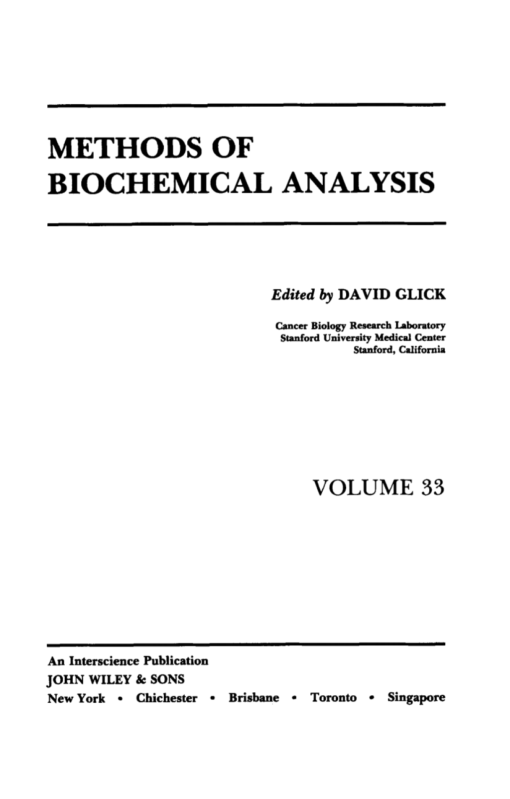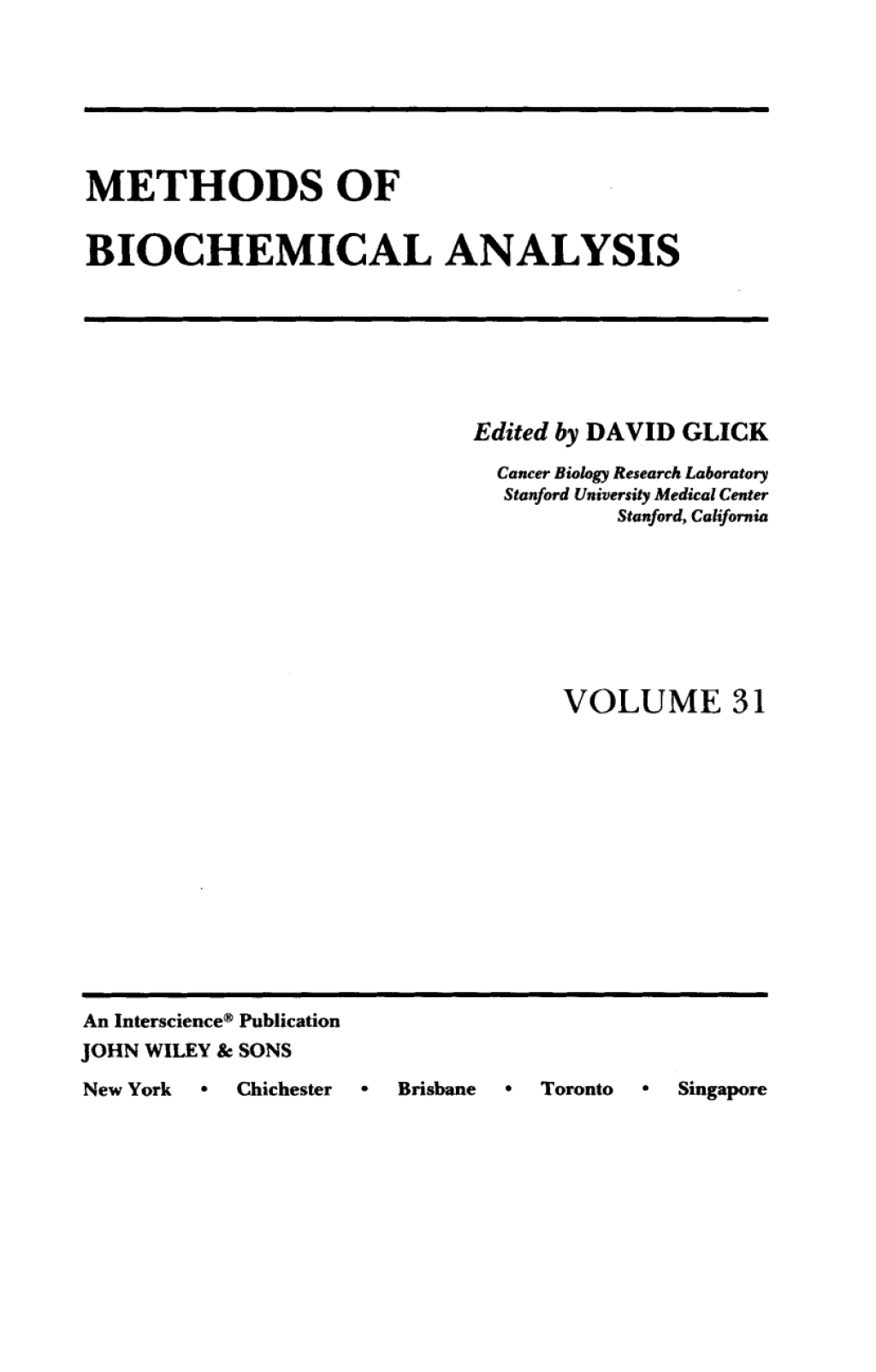 Biochemical analysis is a rapidly expanding field and is a key component of modern drug discovery and research. Methods of Biochemical Analysis provides a periodic and authoritative review of the latest achievements in biochemical analysis. Founded in 1954 by Professor David Glick, Methods of Biochemical Analysis provides a timely review of the latest developments in the field.