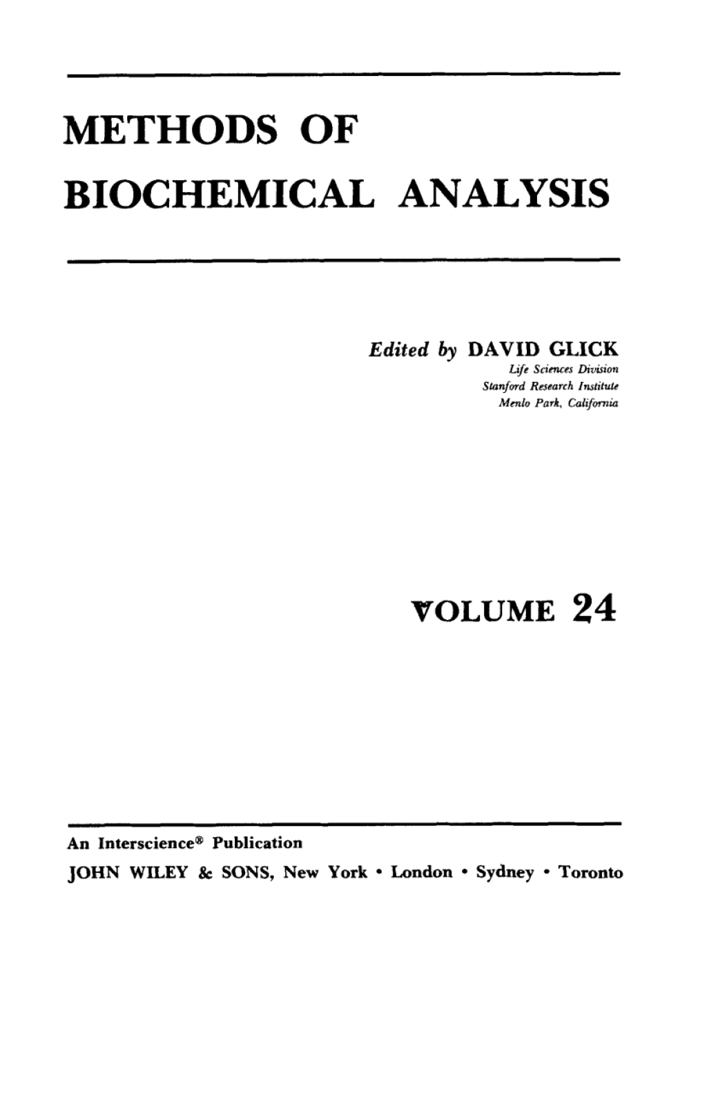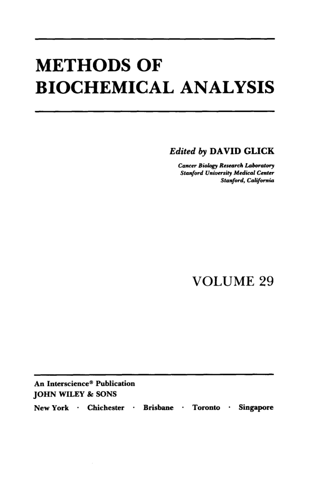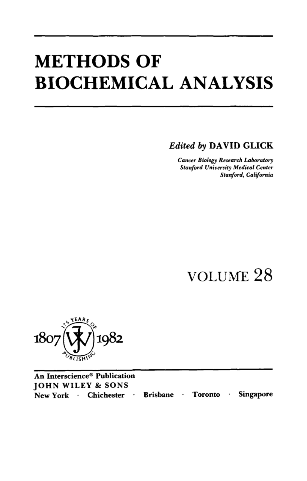 Biochemical analysis is a rapidly expanding field and is a key component of modern drug discovery and research. Methods of Biochemical Analysis provides a periodic and authoritative review of the latest achievements in biochemical analysis. Founded in 1954 by Professor David Glick, Methods of Biochemical Analysis provides a timely review of the latest developments in the field.