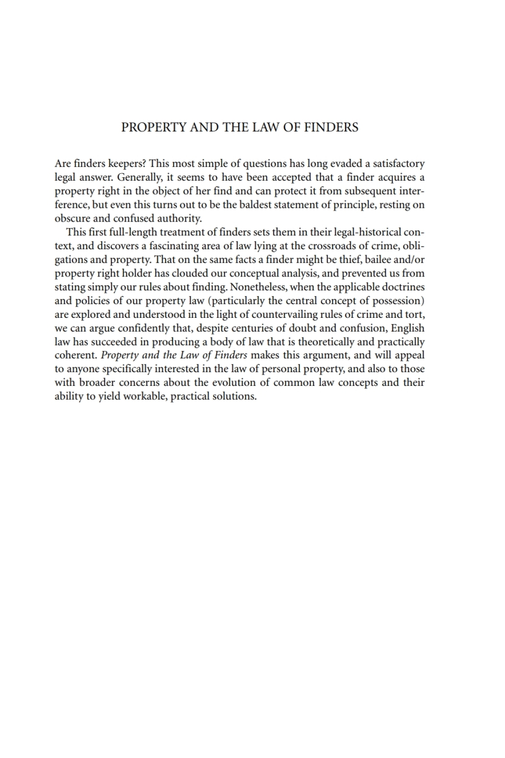 Are finders keepers? This most simple of questions has long evaded a satisfactory legal answer. Generally it seems to have been accepted that a finder acquires a property right in the object of her find and can protect it from subsequent interference, but even this turns out to be the baldest statement of principle, resting on obscure and confused authority. This first full-length treatment of finders sets them in their legal-historical context, and discovers a fascinating area of law lying at the crossroads of crime, obligations, and property. That on the same facts a finder might be thief, bailee, and/or property right holder has clouded our conceptual analysis, and prevented us from stating simply our rules about finding. Nonetheless, when the applicable doctrines and policies of our property law (particularly the central concept of possession) are explored and understood in the light of countervailing rules of crime and tort, we can argue confidently that, despite centuries of doubt and confusion, English law has succeeded in producing a body of law that is theoretically and practically coherent. Property and the Law of Finders makes this argument, and will appeal to anyone specifically interested in the law of personal property, and also to those with broader concerns about the evolution of common law concepts and their ability to yield workable, practical solutions.
